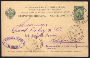Lot 335 1896 (September 19), 4k postal stationery card from Trebizond to Halifax, Nova Scotia, struck with two fine c.d.s. of ТРЕБИЗОНДЪ with ОДЕССА (Odessa, 26 Sep) transit on face, faint Halifax, N.S. (Oct) receiver, the reverse showing an English message offering stamps in philatelic exchange, routed from the ROPiT Trebizond agency by steamer to Odessa and onward to Canada, a rare destination, fresh and very fine. Sold for C$325.00 plus 18% buyer’s premium.